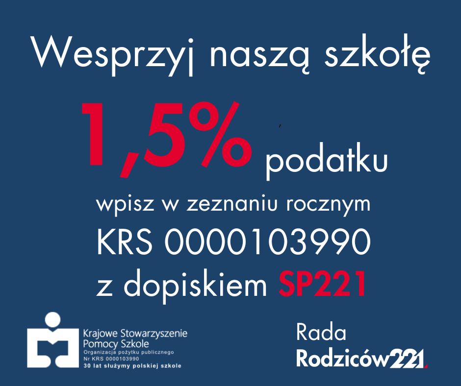 Już od 15 lutego możesz rozliczyć podatek za 2025 rok - zachęcamy do przekazania 1,5% podatku dla naszej Szkole Podstawowej nr 221 z Oddziałami Integracyjnymi im. Barbary Bronisławy Czarnowskiej w Warszawie. Dzięki współpracy Rady Rodziców z Krajowym Stowarzyszeniem Pomocy Szkole możecie przekazać 1,5% podatku na działania naszej szkoły, wspieranie uczniów, realizację projetów budujących relacje.